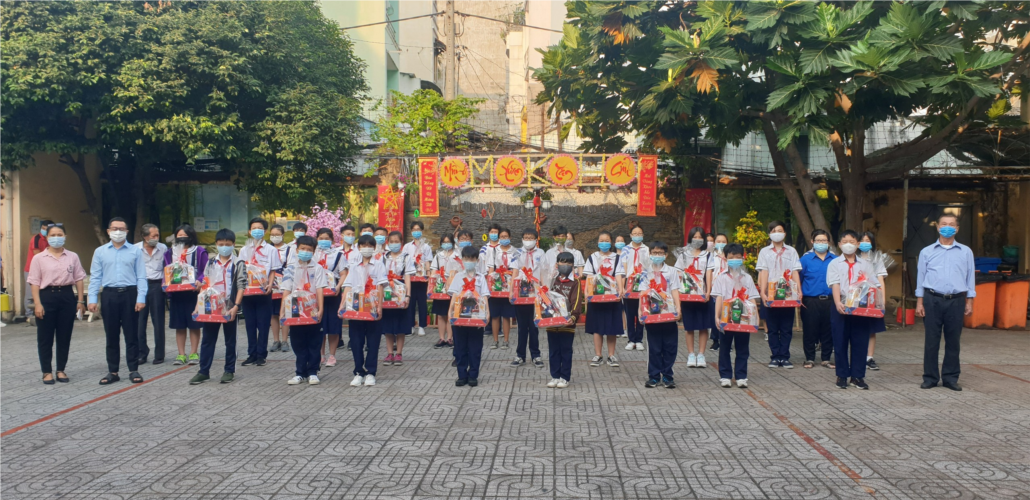 Thầy Lê Phước Đạt - Hiệu trưởng nhà trường và ông Lý Văn Quyền - Phó ban liên lạc cựu học sinh trao quà cho học sinh khối 6